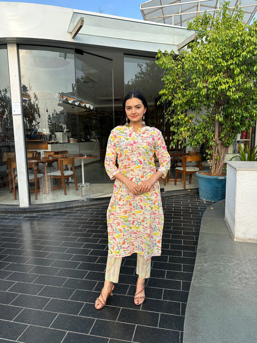 Cream Brush Print kurti pant set