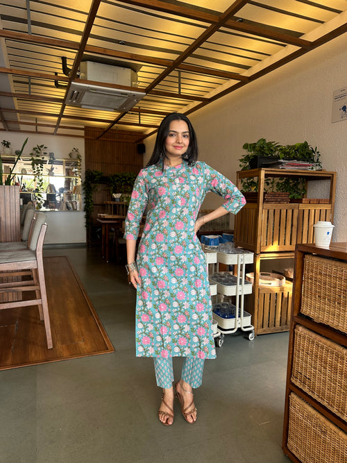 Turkish Blue Sanganeri Print Kurti Pant Set