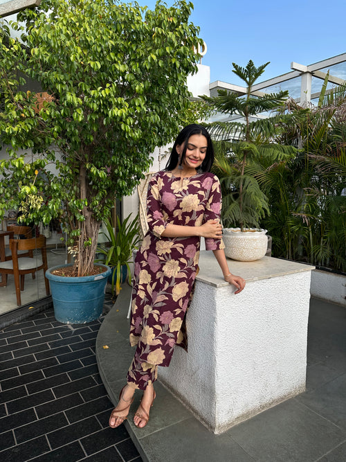 Wine Floral Foil Printed Kurta Set