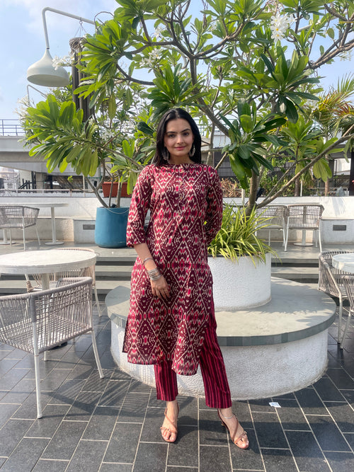 Elegant Maroon Ikat Print Kurti Pant Set